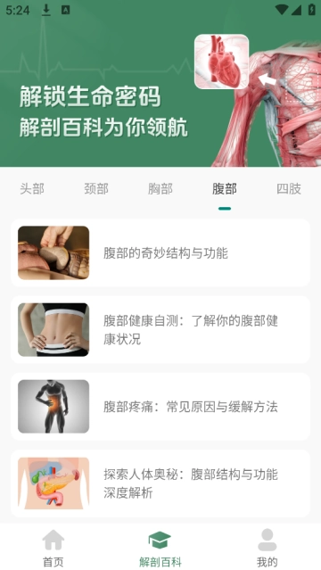 头部、脊柱、胸部、腹部、上肢、下肢等身体各个部位,只需轻轻一点,就能分类查看每个部位。