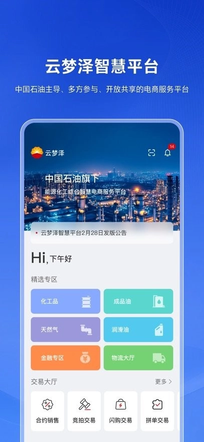云梦泽智慧平台是中国石油旗下能源与化工产业智慧电商服务平台,以电商交易为核心,向客户及供应商提供统一交易、物流、金融、数据、技术等综合生态服务,构建中国石油主导、多方参与、开放共享的智慧能源与化工产业生态圈。