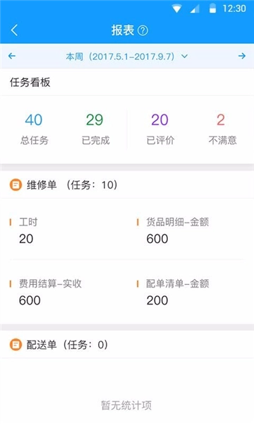 报表统计了全部任务信息,划分出任务看板、维修单和配送单三个栏目,每个栏目都展示了详细的分类与具体内容。