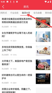 资讯页面设有宏观形势、行业动态等栏目,“脑洞大开”板块会发布建筑专业就业等热点文章,文章附带阅读量,帮助用户了解行业趋势和市场观点。