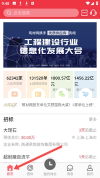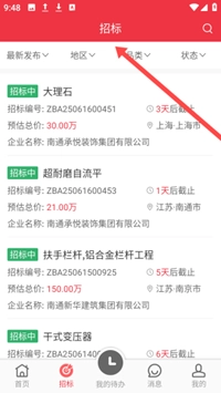 招标页面展示了大理石、超耐磨自流平之类的工程招标信息,上面标注着招标编号、截止时间、预估总价以及地区企业等内容,还支持按照发布时间、地区、品类、状态进行筛选,能帮助用户迅速找到建材采购的相关信息。