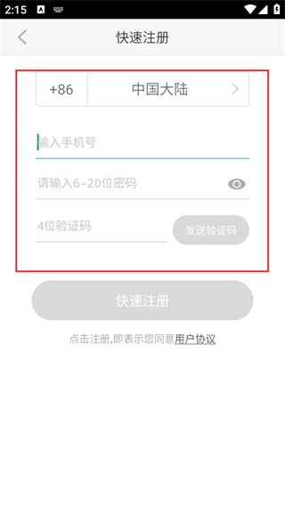 在快速注册页面,先选择对应地区,接着依次填写手机号码、设置6至20位的密码,再输入4位验证码,所有信息填写完毕后点击【快速注册】按钮,就能完成账号创建。