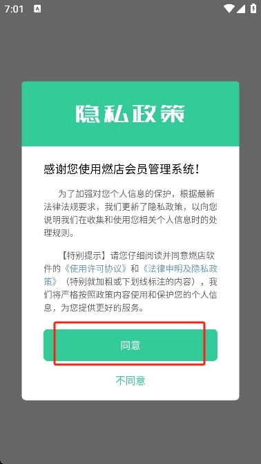 首先请阅读并同意燃店会员管理系统的隐私政策,然后点击“同意”按钮以继续操作。这是使用燃店软件的首要步骤,旨在确保您已充分了解并认可相关条款内容。
