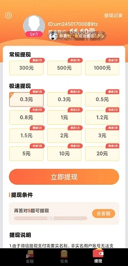 视频答人秀,答对5题就能提现0.3元,秒到微信零钱!付款商户显示为“三妖娱乐中心”。游戏里的各类道具能帮大家快速闯过所有关卡,完成的任务越多,就能赢取越丰厚的奖励,感兴趣的小伙伴快快来参与吧。