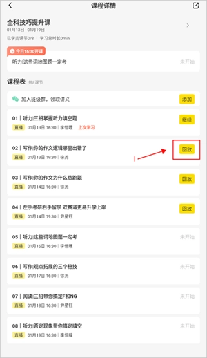 进入界面后,在课程表下方找到对应课程,其右侧会有“回放”按钮,点击即可观看课程回放。