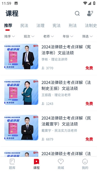 打开文运法硕,进入“课程”功能界面后,点击对应的课程即可进入。
