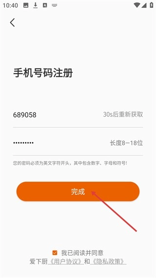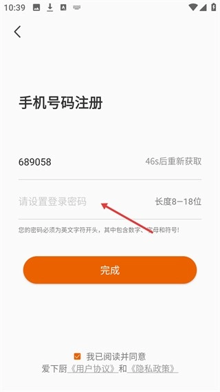 4、填写好验证码以及符合要求的登录密码后,点击【完成】按钮,即可完成爱下厨的手机号码注册流程。