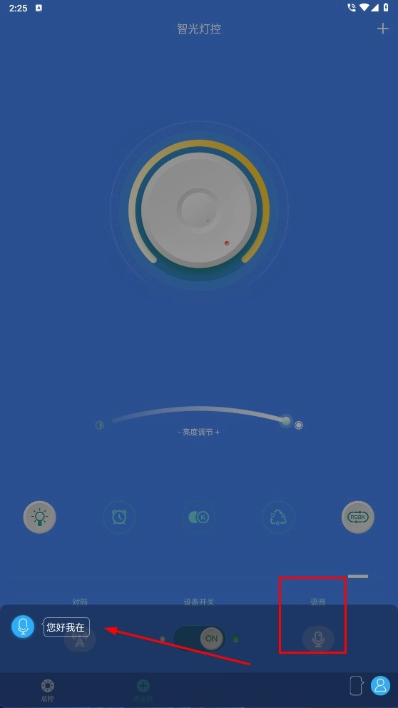 点击【语音】功能后,就能借助语音指令来操控灯光了,比如先说出“您好我在”唤醒系统,之后再进行相关操作。
