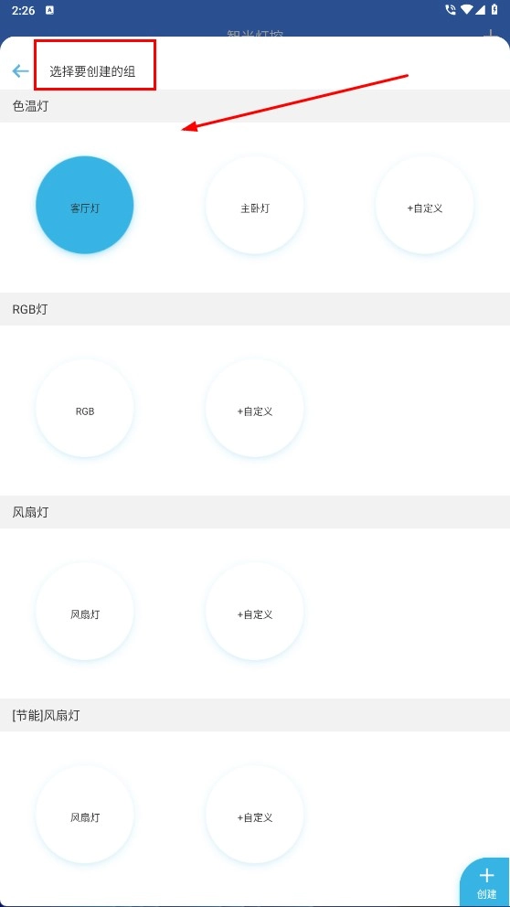 点击创建组选项后,你可以挑选想要创建的灯组,比如色温灯分类下的客厅灯、主卧灯等,也能够自行定义灯组的类型。