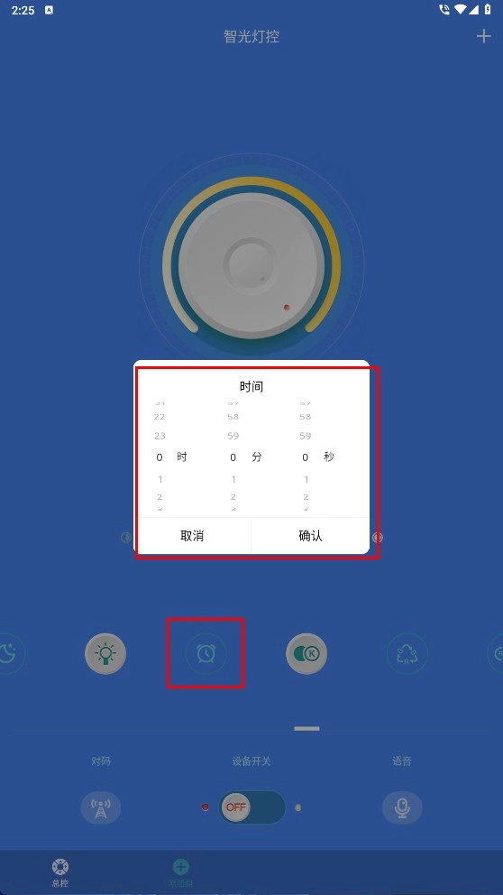 点击闹钟图标,能够设置灯光开启或关闭的时间,完成设置后点击【确认】按钮,该设置即可生效。