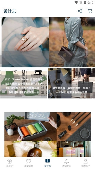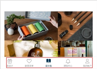 进入软件后,界面分为五大分类板块:逛设计、欲望清单、设计志、通知中心、我的账号。