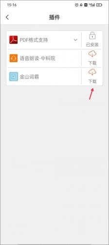 3、这里显示了三个插件:PDF格式支持、语音朗读。中科院、金山词霸,点击右边的“”。