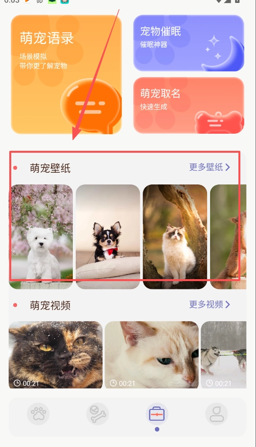 三、另外,探索软件的各类趣味功能,在发现页面,你能体验宠物催眠、智能取名等工具,还可以浏览萌宠语录与壁纸。