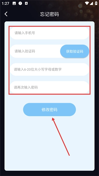 在忘记密码页面,先输入手机号,接着获取并填写验证码,然后设置新密码,最后点击【修改密码】按钮,即可完成密码重置操作。