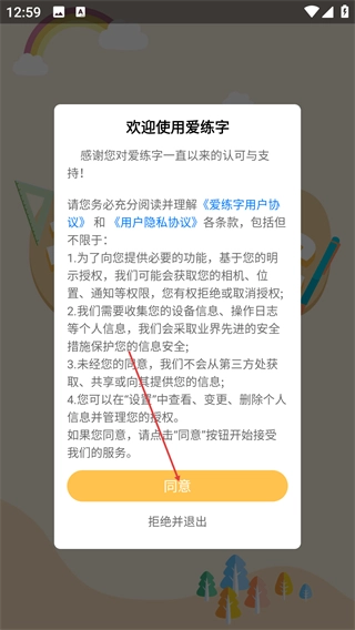 1、打开【爱练字】后,阅读《用户协议》和《隐私协议》,点击【同意】按钮,即可进入应用流程。