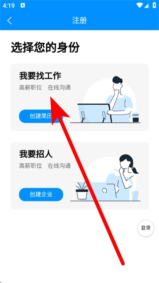 4、在身份选择页面,点击创建简历,进入新用户注册页面。