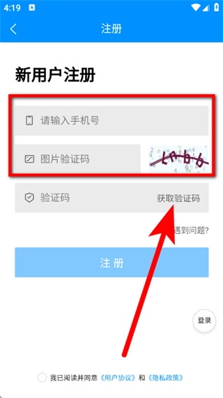 5、在新用户注册页面,输入手机号,点击获取验证码。