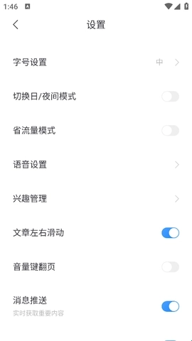 点击进入后,就能看到字号设置、语音设置、消息推送等所有设置选项。