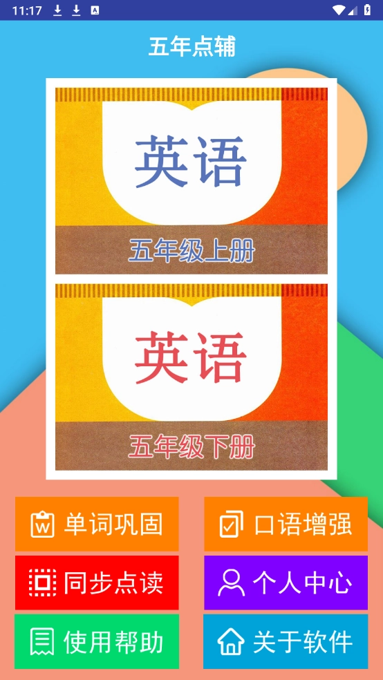 打开软件后,里面涵盖了五年级英语学习的诸多板块,像单词学习、口语练习以及课本同步学习等内容都包含在内。