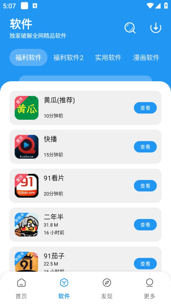 “软件”页面设有详细的应用分类,涵盖漫画类、工具类、影视类等类别。
