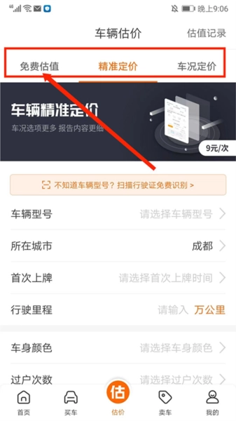 2、进入【车辆估价】界面,包括【免费估值】、【精准定价】和【车况定价】等类型,用户可根据需求相应的估价类型即可,这里以【免费估值】为例,