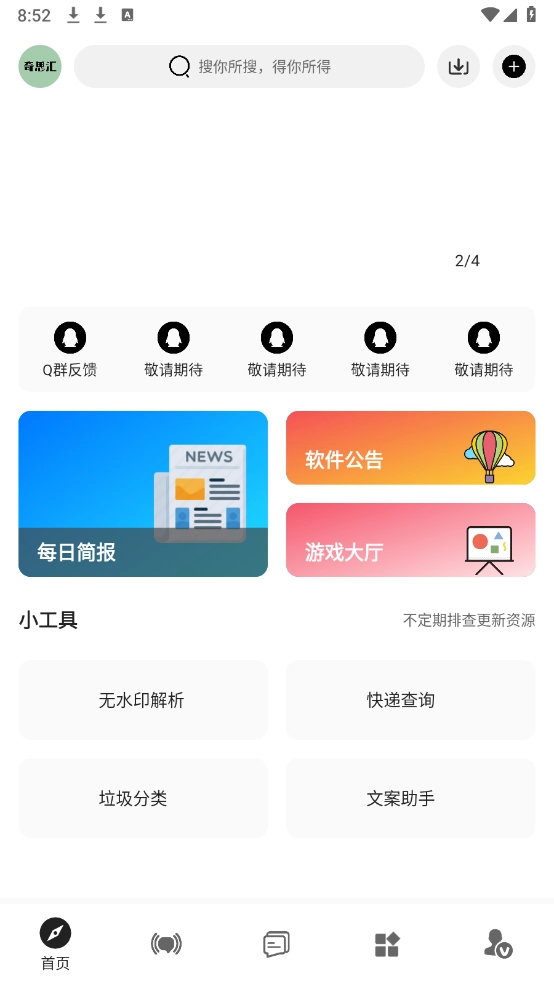 打开软件后,首页陈列着不少实用小工具,像无水印解析、快递查询和文案助手都在其中。
