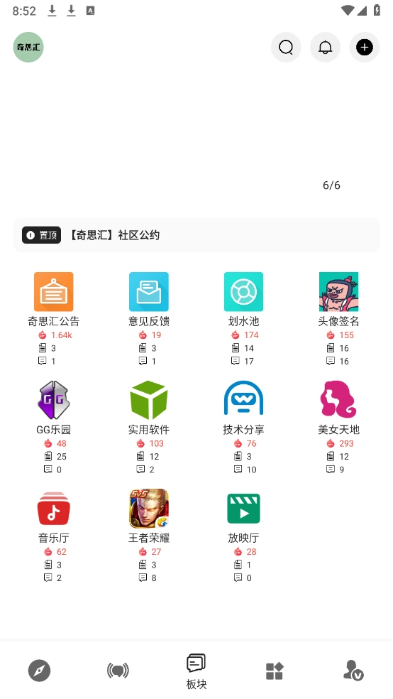 点击“板块”,有游戏、音乐以及技术分享等内容。