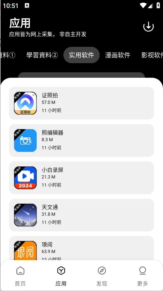 点击“应用”栏目后,你会看到详细的软件分类,涵盖漫画、学习、影视等多种类型。