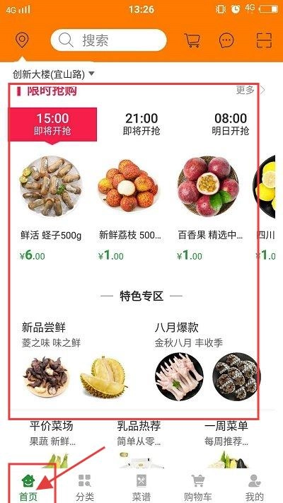 是一款专注于生鲜购物的超市平台,依托智能供应链与冷链物流体系,构建了集食材采购、菜谱推荐、配送到家于一体的全链路服务生态。该平台拥有超5000种生鲜商品,覆盖蔬菜、水果、肉禽、海鲜等全品类,日均配送订单超20万单,以其新鲜、便捷、安全的特性,成为用户日常生鲜采购的首选工具。1、打开应用,在首页有【限时抢购】的商品可以进行购买。
