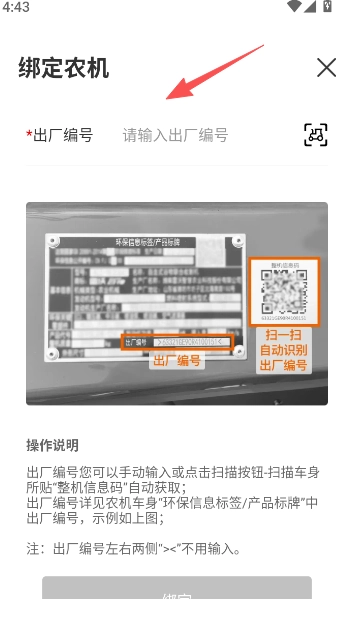 2、输入农机编号或是扫码的方式录入,完成绑定车辆的操作。