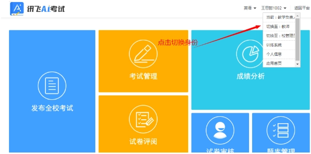 您好,教师登录后,点击进入在线考试,点击右上角。点击切换至:教学负责人/教师角色,管理员,即可切换到对应角色
