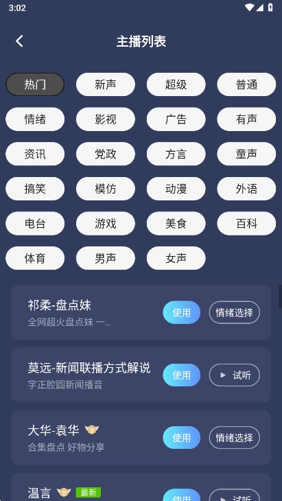 2、点击更换主播,可以直接切换不同的音色