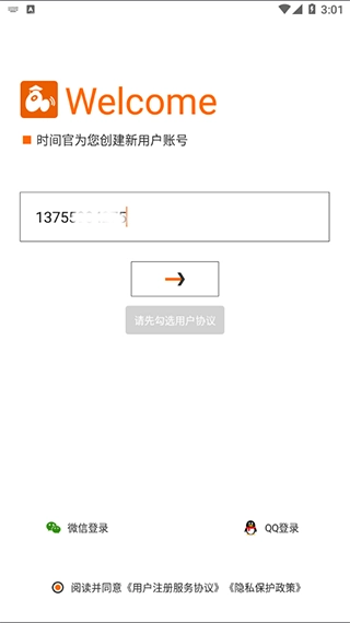 1、打开时间官闹钟,输入手机号完成账号注册;