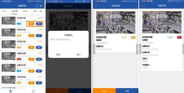 告警管理应用支持告警查询、告警处理、告警统计功能。在告警中,可查看告警的详细信息,同时可以处理告警信息;在统计中,可以按照日统计和月统计来查看告警数据分析。厂区内告警信息可实时同步数据到现场监控室告警大屏,云端信息也可以同步到安智通,方便用户随时随地查看管理。