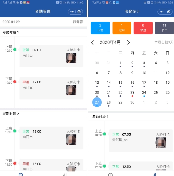 进入考勤管理页面。可查看今日的人脸打卡记录。进入个人考勤统计页。可查看当月的考勤数据,包括出勤天数,正常、迟到、早退、旷工次数。默认显示当天的考勤记录,可在日历中选择某一天查看当天的考勤记录。