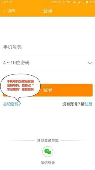 2、手机号码与“建融家园”注册手机号码一致,密码忘记直接点击“忘记密码”,重置即可!如没有建融家园,选择注册即可。