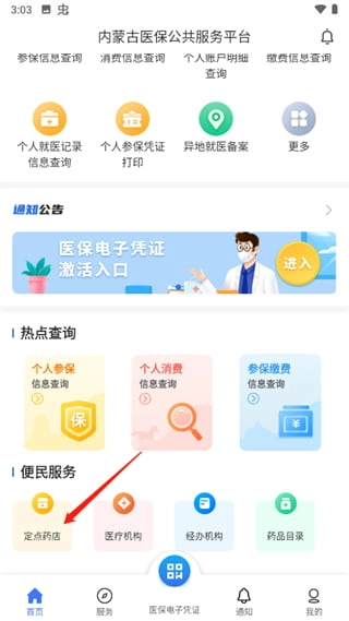 1、进入内蒙古医保的首页,点击“定点药店”。