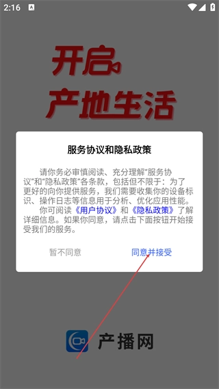1、进入应用后,需阅读【服务协议和隐私政策】,确认后点击【同意并接受】按钮,即可开启服务。