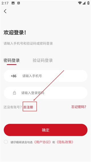 3、登录界面支持【密码登录】和【验证码登录】,若未注册账号,可点击【去注册】按钮进入注册页面。
