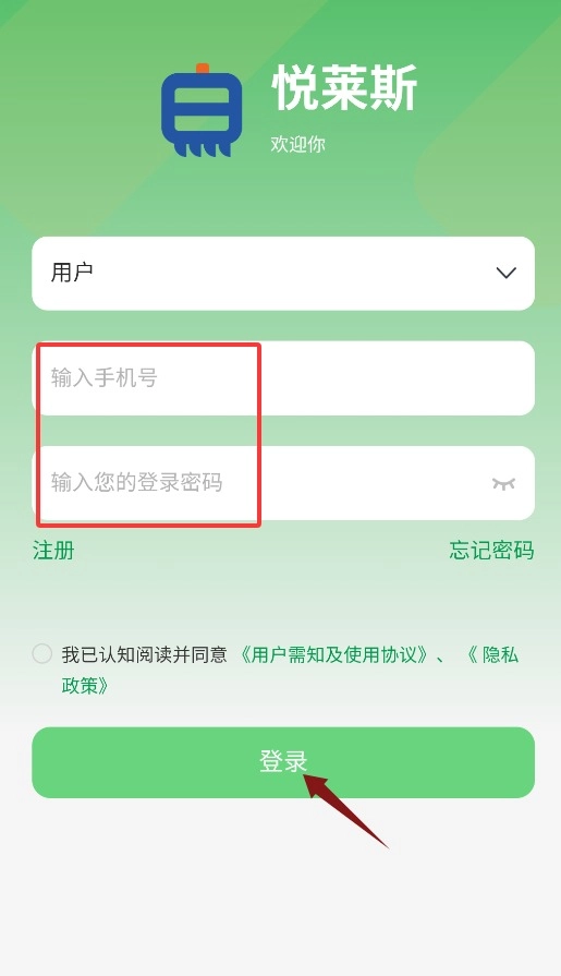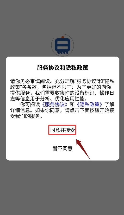1、首次启动应用需点击同意服务协议和隐私政策,确认后方可进入登录界面。