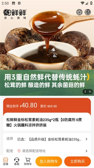 4、进入【松鲜鲜金标松茸素蚝油】详情页,选好规格填配送地址后,可点击【加入购物车】或【立即购买】完成操作。