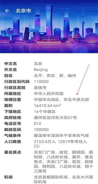 4、查看完成后,可进一步查看北京市的详细信息,包括面积人口等内容,完成城市信息的查询。