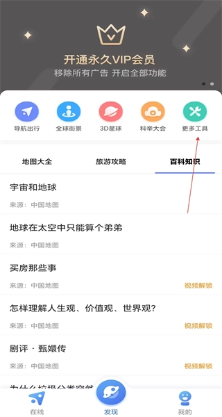 1、打开软件后,进入发现页面看到百科知识等分类,选择更多工具选项,进入实用工具页面。