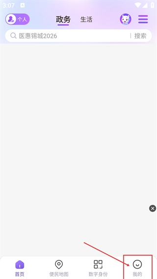2、处于政务页面时,点击底部导航栏的【我的】选项,可进入个人功能页面,为后续账号操作做准备。