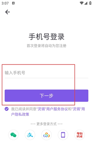 4、进入【手机号登录】页面,先填【输入手机号】,勾选协议后点【下一步】,也可选其他方式完成登录。