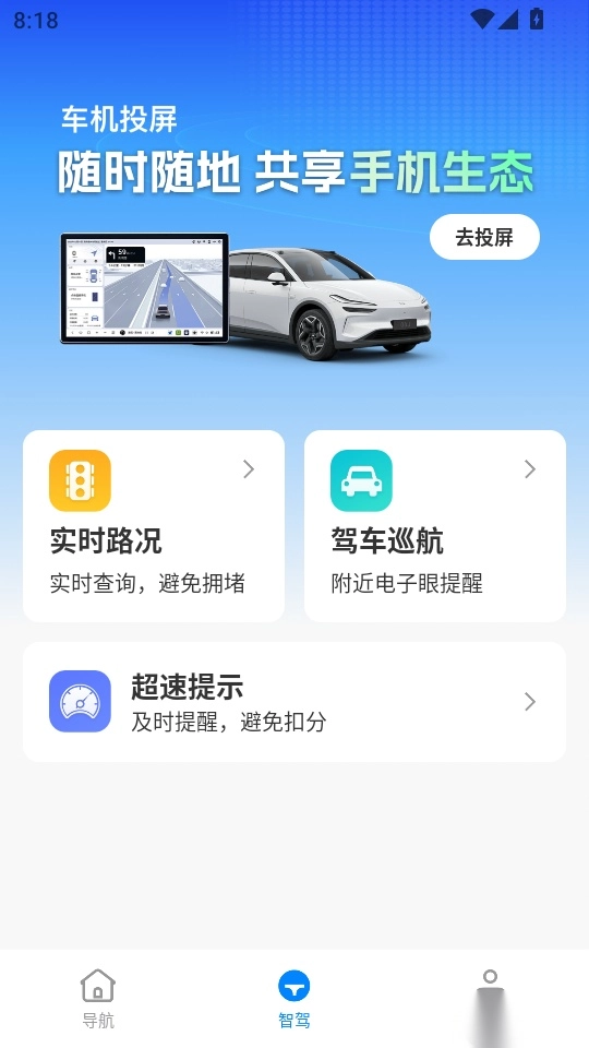 智驾级导航这是一款专门为开车用户们提供高质量地图导航和快捷出行功能服务的应用软件,在这里大家能够随时查看开车路况详情,能够轻松实现手机与车技屏幕共享,帮助用户在车机屏幕当中也能高清查看地图导航详情内容;而且该平台还拥有实时的地图路况信息查询,帮助大家精准知晓地图导航最新动态,享受畅通无堵的导航规划与安排;与此同时,在智驾级导航手机版软件当中还拥有不错开车超速提示工具,防止用户开车超速情况出现;喜欢这款程序软件的用户朋友们可以来本站直接体验一番。