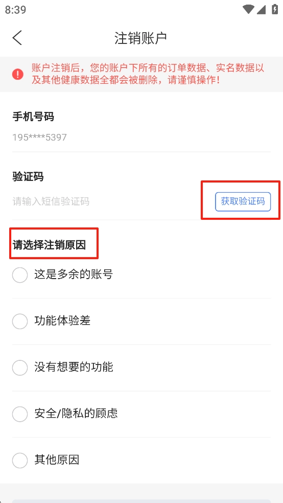 输入【验证码】后,挑选注销原因,最后点击【确认注销】就可以了
