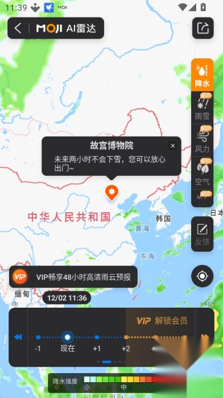 打开墨迹天气应用,进入雷达图或云图页面后,点击暂停按钮,就能关闭AI雷达的动态降水预报功能,此时页面将仅展示实时数据。