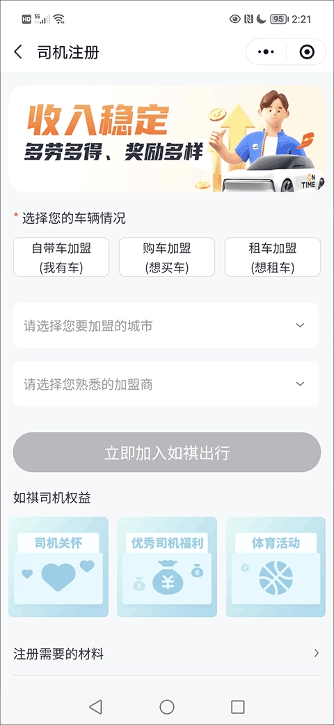 3、接着在此处填写您的加盟城市与加盟商信息,之后选择并点击“立即加入如祺出行”这一选项;