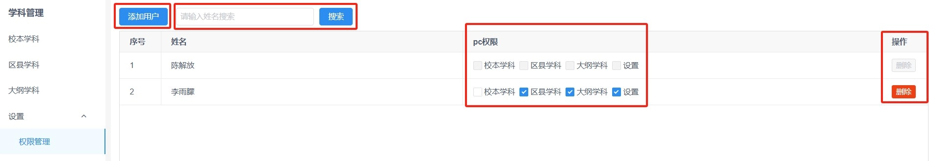 4、设置-权限管理:可添加或删除权限用户,能通过输入姓名搜索用户,支持以勾选或取消勾选的方式为用户分配或取消权限。